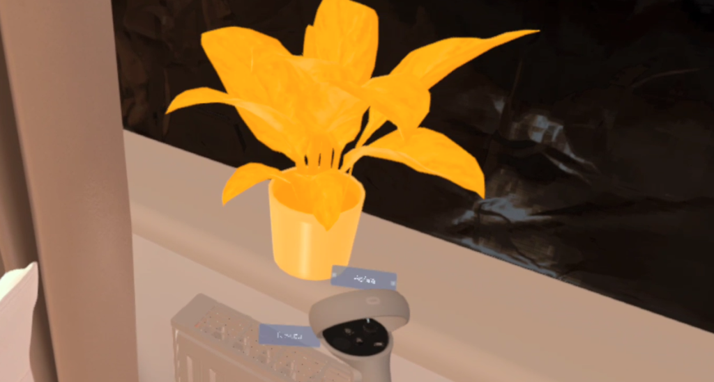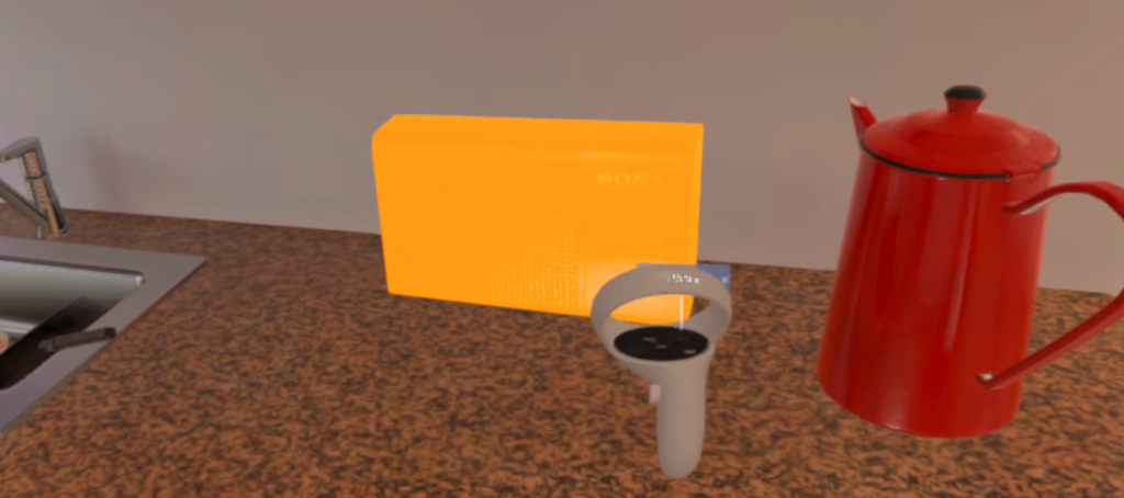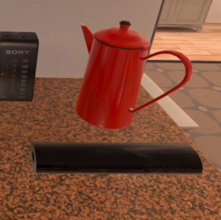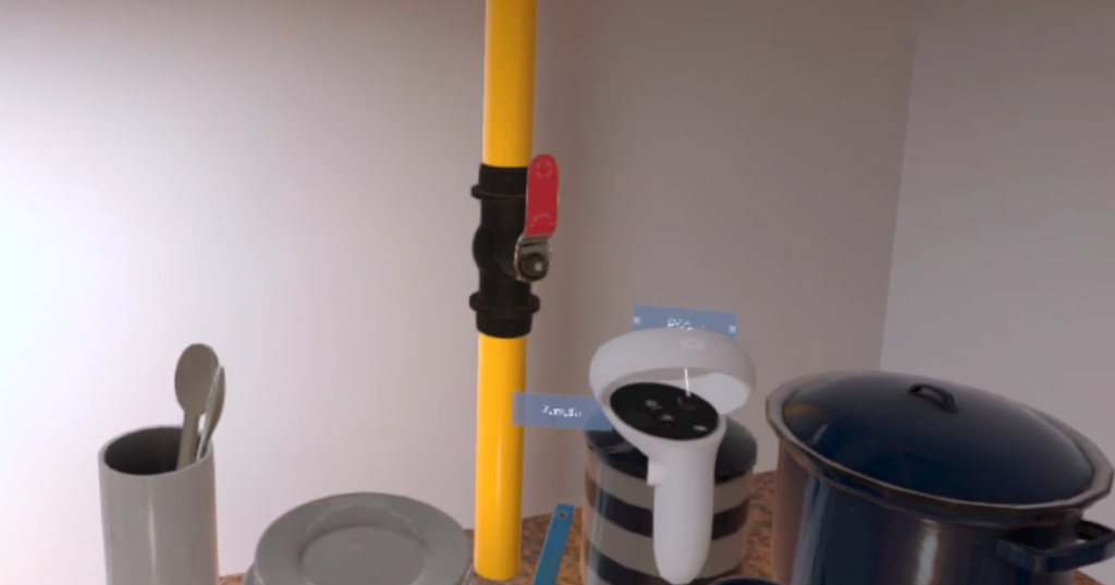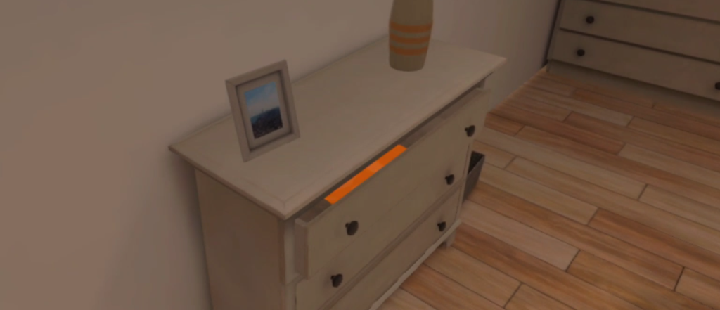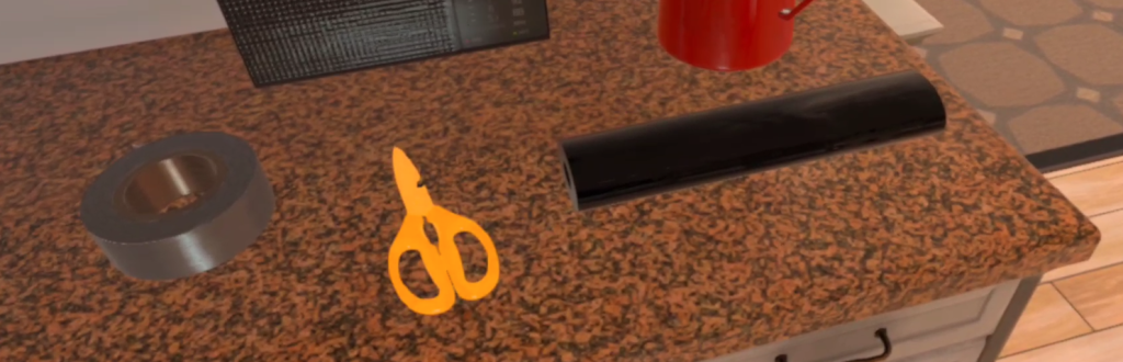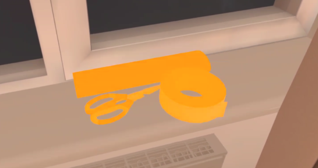 Akende katmiseks on Sul vaja teipi, prügikotte ja kääre. Kõik 3 eset asuvad köögikapi peal. Osuta eseme peale puldi eesoleva nupuga. Leitud esemed haihtuvad peale nendele