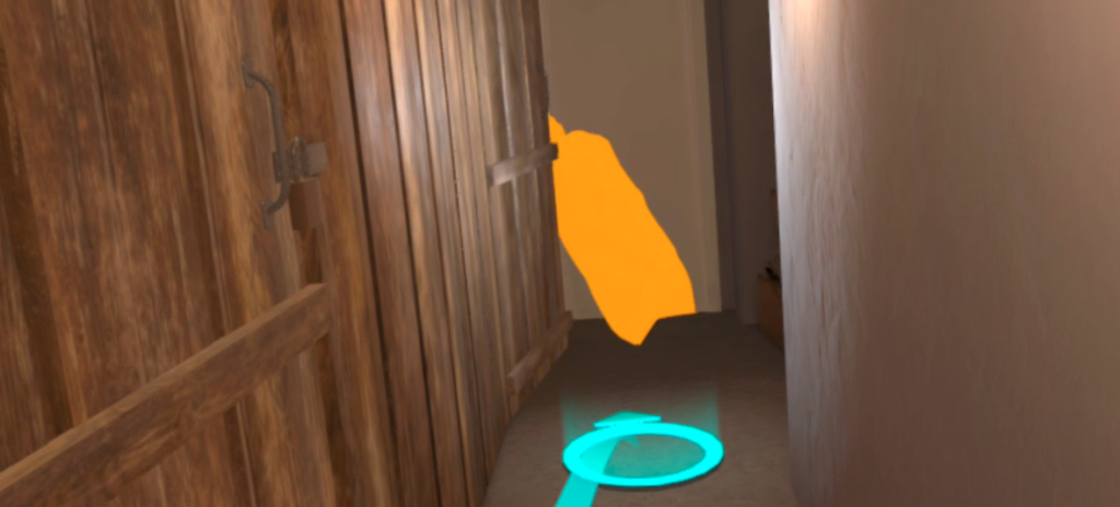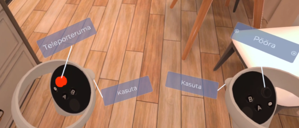 ▪ Teleportimise nupp (puldi peapaneeli kõrgem väljaulatuv nupp) on edasiliikumiseks. Teleportimine toimub ainult vasaku käega. Nuppu vajutades tekib kas sinine joon ringi ja noolega (liikumine sinna kuhu suunad) või punane joon (keelav ja edasi ei saa liikuda, näiteks seina peale on ostutatud). Nool ringi ääres näitab seda kuhu poole Sa näoga jääd – kui soovid enne liikumist näo konkreetsesse suunda keerata, siis keeruta teleportimise nuppu vastavalt vajadusele.